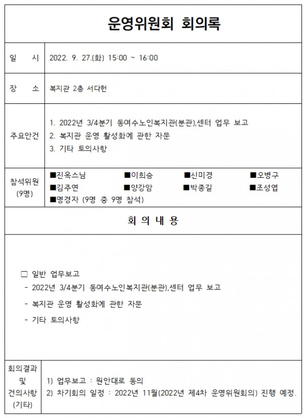 2022년 동여수노인복지관 3차 운영위원회의 결과공고