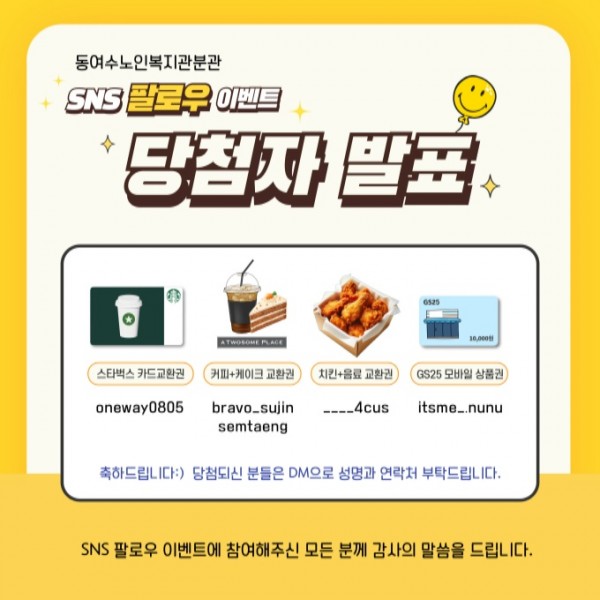 동여수노인복지관분관 SNS 팔로우 이벤트에 참여해주신 모든 분께 감사의 말씀을 드립니다:)