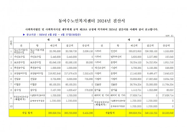 『사회복지법인 및 사회복지시설 재무회계 규칙 제19조』규정에 의거하여 2024년 동여수노인복지센터 결산을 공고합니다.
