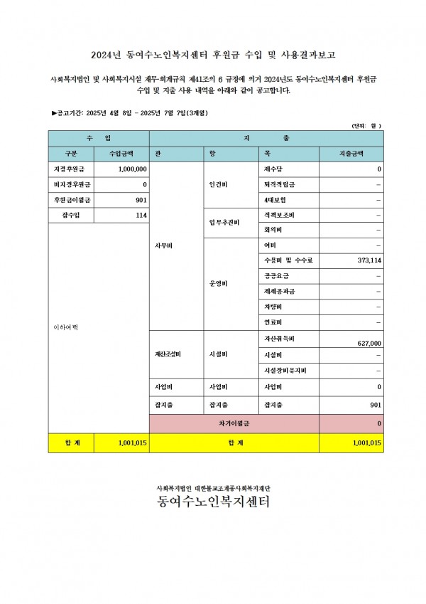 사회복지법인 및 사회복지시설 재무회계규칙 제41조의6 2항에 의거하여 2024년 동여수노인복지센터 후원금 수입 및 사용 결과를 공고합니다.