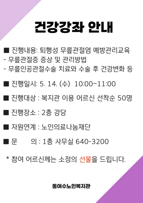 동여수노인복지관 퇴행성 무릎관절염 예방관리교육 안내
