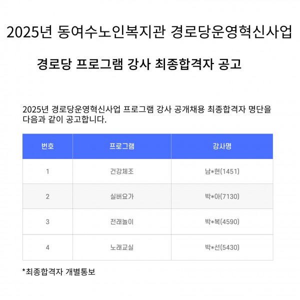 2025년 경로당운영혁신사업 프로그램 강사 최종 합격자 공고