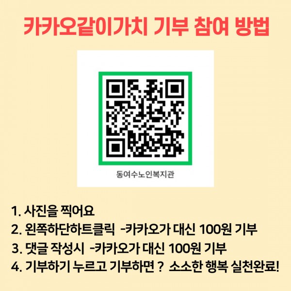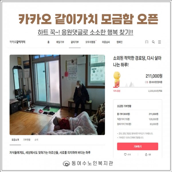 지역 내 소외된 경로당 어르신들을 위해 즐겁고 의미있는 여가 프로그램을 마련하고자 카카오같이가치 모금함을 오픈하였습니다.
