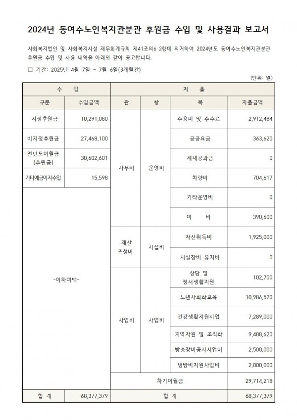사회복지법인 및 사회복지시설 재무회계규칙 제41조의6 2항에 의거하여 2024년도 동여수노인복지관분관 후원금 수입 및 사용 결과를 공고합니다.