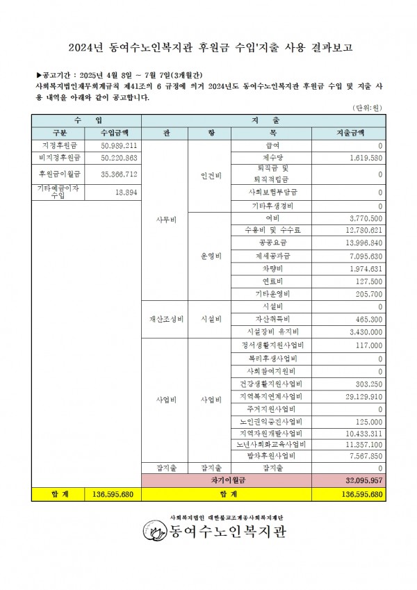 사회복지법인 및 사회복지시설 재무회계규칙 제41조의6 2항에 의거하여 2024년도 동여수노인복지관 후원금 수입 및 사용 결과를 공고합니다.