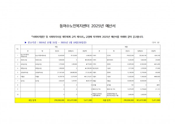『사회복지법인 및 사회복지시설 재무회계 규칙 제10조』규정에 의거하여 2025년 예산서를 아래와 같이 공고합니다.