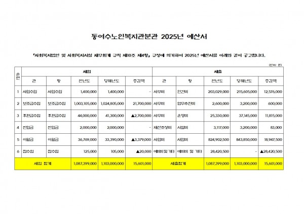 사회복지법인 및 사회복지시설 재무회계규칙 제 10조 4항에 의거 동여수노인복지관분관 2025년 예산서를 공고합니다.