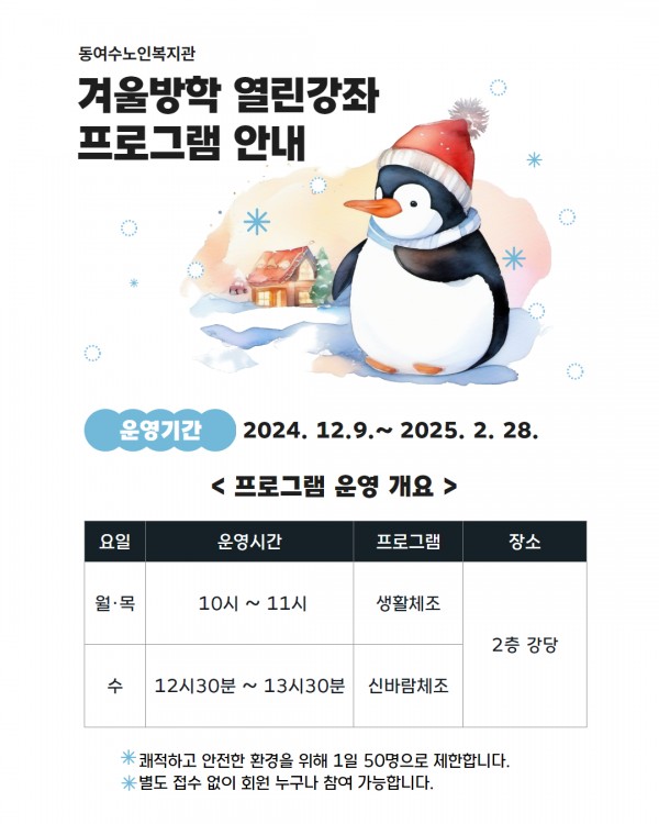 동여수노인복지관 겨울방학 열린강좌 운영 안내
