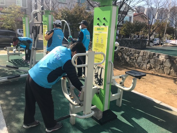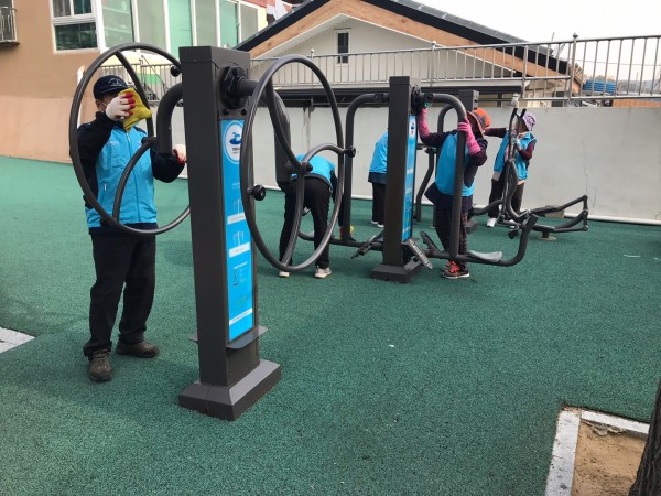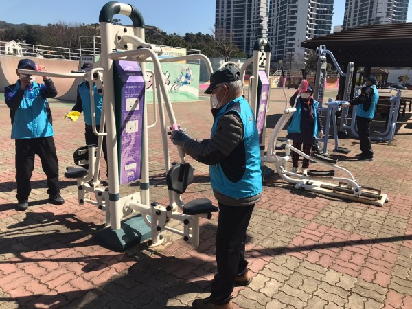 생활체육시설소독 사업단 3월 활동모습입니다!! 지역주민들이 체육시설을 산뜻하게 이용하실 수 있도록 손이 닿는 어디든 깨끗하게 소독 활동을 하고 있습니다. 날씨가 따뜻해지고 있는 요즘 어르신들은 야외에서 시원한 공기를 마시면서 즐겁게 일을 하고 있습니다.