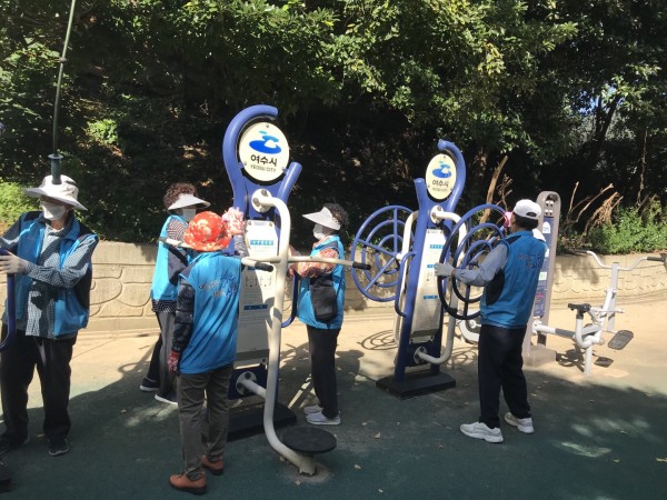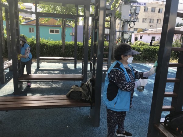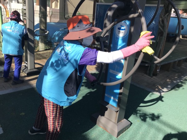 지역 주민들이 안전하게 체육시설을 이용할 수 있도록 소독 활동을 하고 계십니다. 날씨가 갑자기 추워졌습니다. 건강 유의하셨으면 좋겠습니다!