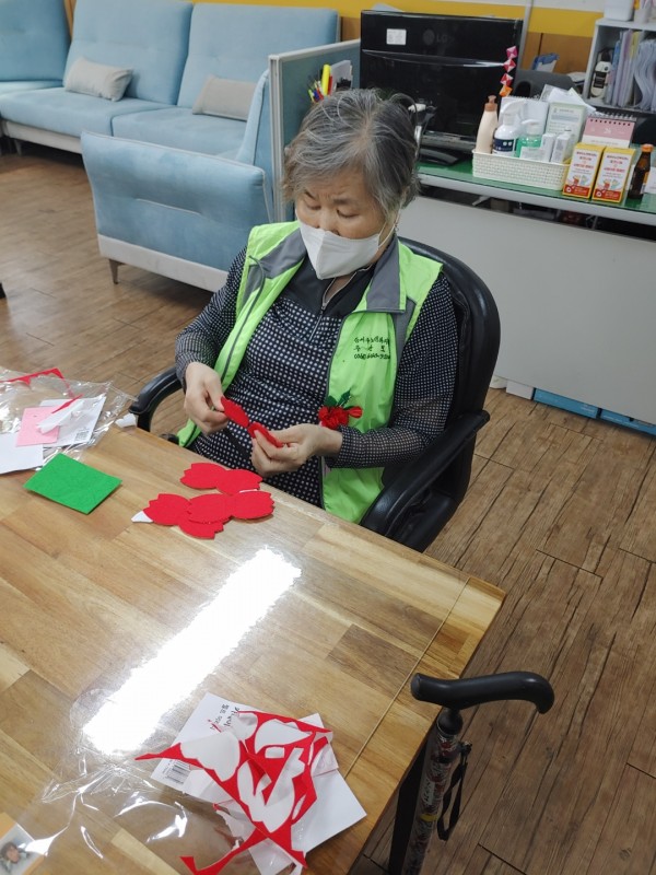 5월 어버이날을 맞이하여 아람회 봉사단체에서 주간보호 이용어르신과 카네이션 머리띠를