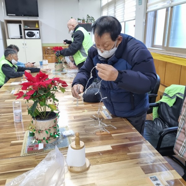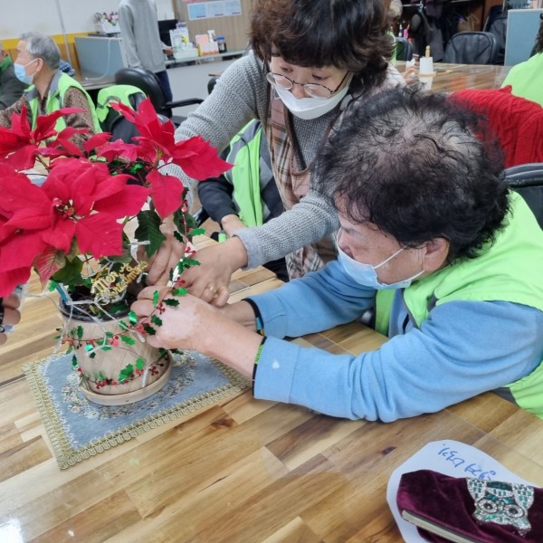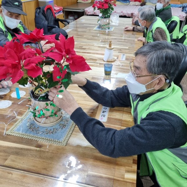 겨울이 되어 계절이 변화한 것을 체감하고, 크리스마스가 어떤 날인지에 대해 알아보며 크리스마스에 했던 일이나 떠오르는 추억에 대해 회상하고 이야기하는 시간을 가지며 다른 어르신들과 함께 친목을 도모할 수 있었습니다. 또한 포인세티아를 이용하여 크리스마스 트리를 꾸미며 새로운 감정과 성취감을 느낄 수 있었습니다.