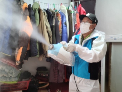 집안 물품 정리정돈, 문틀, 손잡이, 집기 등 손때가 많이 타는 곳을 알코올로 닦고, 소독기계로 집안 곳곳 방역을 진행했습니다.