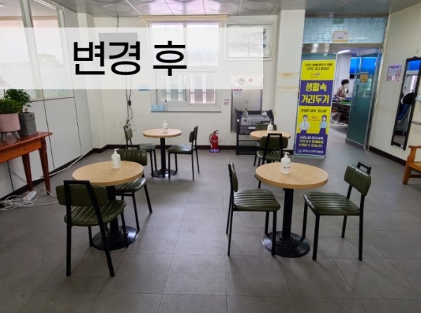 테이블과 의자가 바뀐 로비에서 담소를 나누시던 어르신들이 카페처럼 변했다고 좋아하십니다.