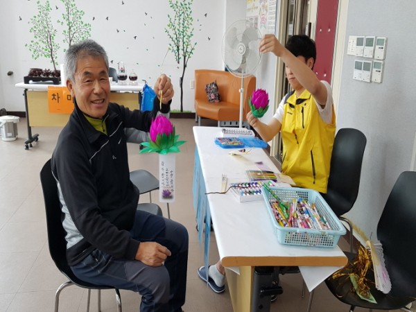 컵등만들기, 염주만들기, 부채만들기 및 소원문 달기, 먹거리 코너를 마련하여 다채로운 불교문화체험의 기회로 어르신들의 호응이 높았습니다.