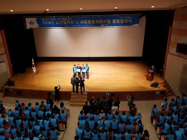 지난 2월 28일 여수시민회관에서 진행된 여수시 2019년 노인일자리 및 사회활동지원사업 각 읍`면동및 수행기관 관계자 및 참여 어르신 900여명이 참석하여 여수시 통합 발대식을 진행하였습니다. 축하공연, 시장님이하 내빈 축사, 참여자 선언문 낭독, 활동교육 내용으로 식이 진행되었습니다. 일자리 참여 어르신들의 자긍심을 높이고 지지하는 계기가 마련된 자리였습니다.