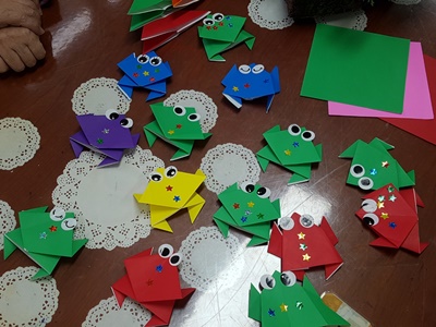 알록달록 색종이로 개구리를 접어 포인트 스티커로 나만의 개구리를 꾸며보았답니다.