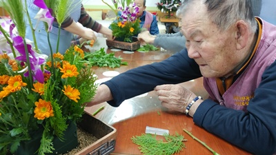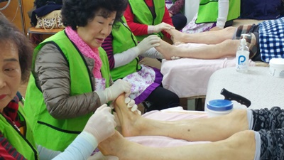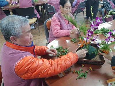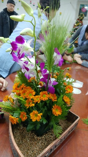 아로마 향을 첨가한 미온수에 발을 담가 족욕을 진행하고, 즐거운 우리집 봉사팀의 발마사지 프로그램이 진행되었답니다. 오후에는 보리와 덴파레, 소국, 편백을 이용한 멋진 합동 꽃꽂이 작품이 완성되었답니다. 정말 멋지지요...