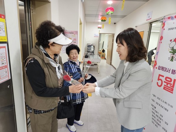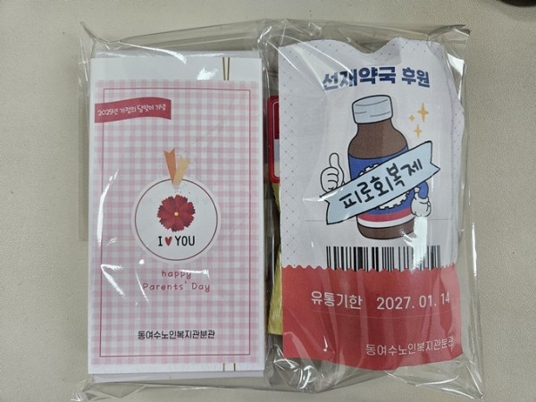 또한 어르신들을 위한 떡 세트 선물과 선재약국의 후원으로 제공된 피로회복제 세트가 증정되었으며, 관장님께서 직접 생화 카네이션을 전달하며 감사와 존경의 마음을 전하는 뜻깊은 시간을 가졌습니다.