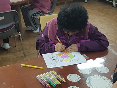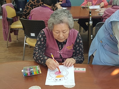 거북이 도안에 색감입히기, 동년배들과 함께 교감을 나누는 손마사지가 진행되어 즐거운 시간을 보낼 수 있었답니다.