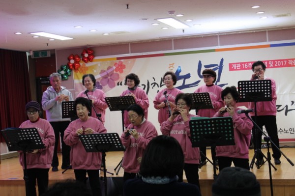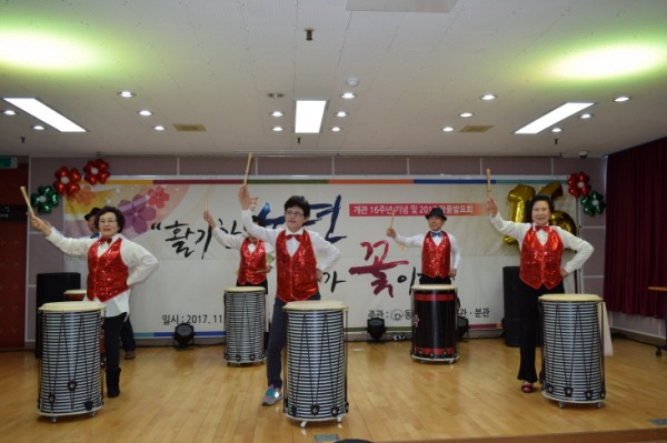 무대에 오른 발표 작품을 세부적으로 보면 우쿠렐라, 풍물, 가체조, 퓨전난타, 한국무용, 오카리나, 하모니카연주단 등 10개 팀이며 복지관 복도와 별도의 프로그램실에는 서예, 한국화, 서각, 문학, 아로마 등이 전시되어 ‘활기찬 노년, 내가 꽃이다’ 슬로건을 더욱 빛나게 했습니다.