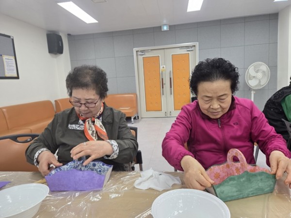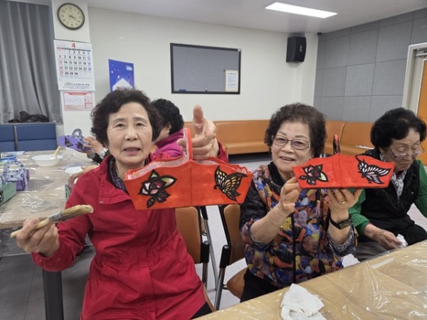나비와 동백꽃 무늬로 아름답게 완성된 작품은 어르신들의 큰 만족과 성취감을 이끌어냈습니다.