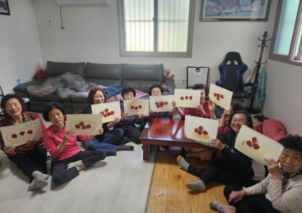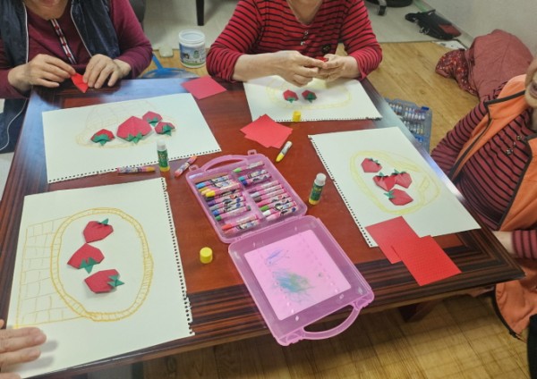 어르신들은 크레파스로 바구니를 그리고, 딸기를 접어 붙이며 정성껏 작품을 완성하셨습니다.