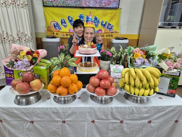 생신축하노래와 함께 작은선물과 꽃다발을 전달하였습니다. 생신을 맞이한 어르신들게