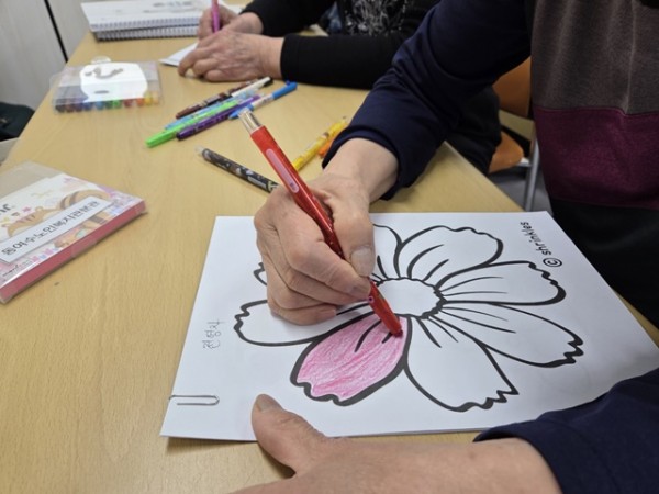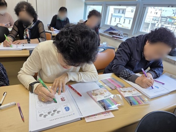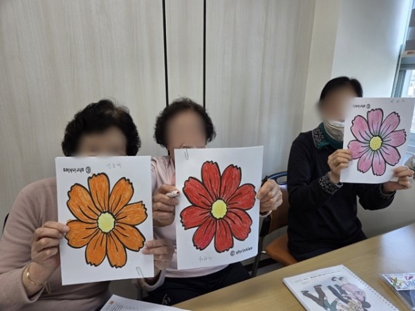 첫 번째 시간은 치매 예방 체조와 인지 활동 교구를 활용한 체험으로 시작하며, 두 번째 시간은 참가자들이 워크북(국어, 산수) 활동에 적극 참여합니다. 마지막 세 번째 시간은 그림 도안 색칠과 꽃 이름 적기 활동을 통해 자존감을 높이고 만족도를 향상시키는 시간이었습니다.