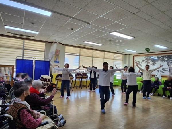 주간보호센터와 요양원 이용 어르신들을 위해 신명나는 난타 공연과 신바람체조를 선보이며