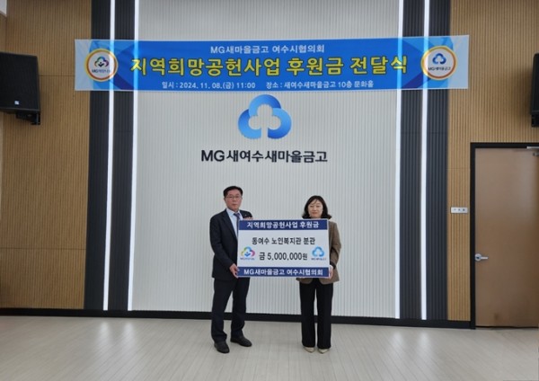 MG새마을금고 여수시협의회(협의회장 정길용)가 지역 어르신의 결식 예방을 위해 4년 연속 후원금을 쾌척했다. 전달식은 8일 MG새여수새마을금고 본점 문화홀에서 협의회와 시청 관계자, 기관단체장 등이 참석한 가운데 개최되었다. 이날 협의회는 ‘지역희망공헌사업’ 후원금 1천 3백여만 원을 동여수노인복지관분관을 비롯해 3개 복지시설에 전달했다.