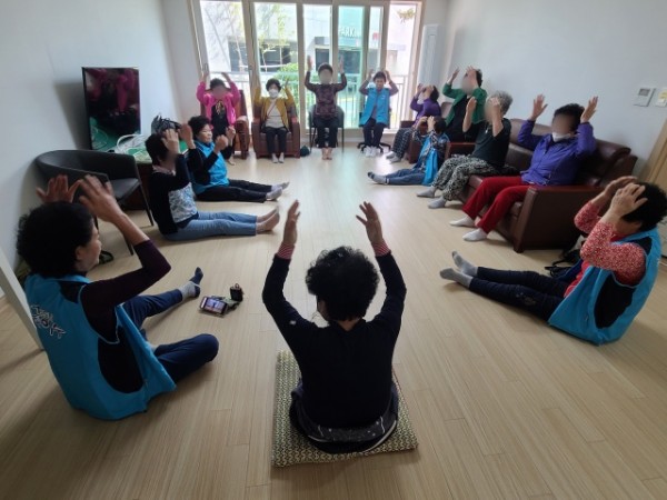 어르신들이 체조로 몸을 풀며 서로서로 건강을 챙기는 모습이 보기 좋습니다.