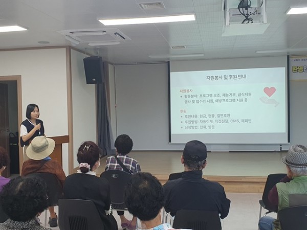 관장님의 따뜻한 인사 말씀을 시작으로 프로그램 이용에 불편함이 없도록 전반적인 정보제공(복지관 사업소개, 프로그램 이용방법, 평생학습 체험 등)과 건강정보(위생관리, 전염병 예방)를 안내하는 시간을 가졌습니다.
