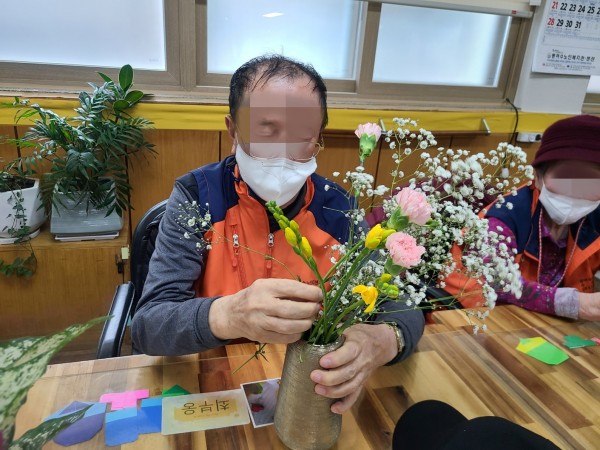 주간보호사업 1월 원예활동으로 후리지아등 여러가지 생화를 직접 만지고 꾸미는