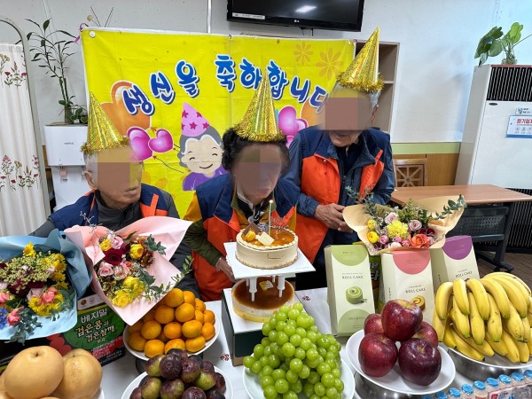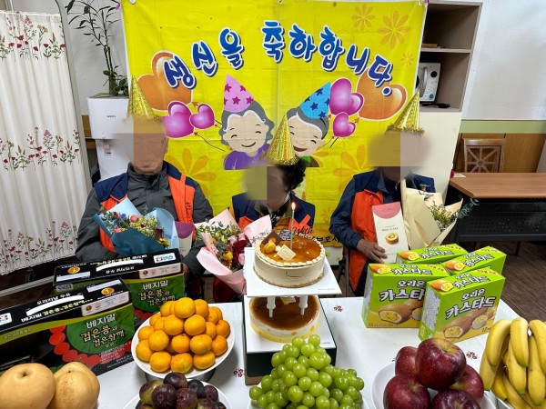 -주간보호사업 이용어르신 윤*근,이*자,이*묵 이용어르신 생신잔치를 진행하였습니다.