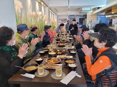 점심을 드셨습니다. 지역 어르신들에게 영양식사지원을 위해 여수행운 무궁화에서 매월 식당나들이를
