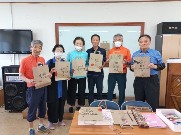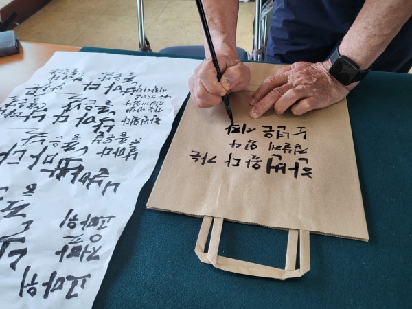 그동안 연습한 솜씨를 발휘하여 종이가방에 멋진 글자와 그림으로 나만의 작품을 만들었습니다.