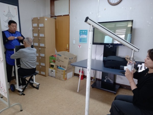 한국건강관리협회에서 문진표 작성과 흉부X-ray촬영에 협조해주셨으며 전에는 폐검진차량에서 진행했으나 검진 장비를 실내 간편 설치하여 거동불편 어르신도 편리하고 안전하게 진행될 수 있었습니다.