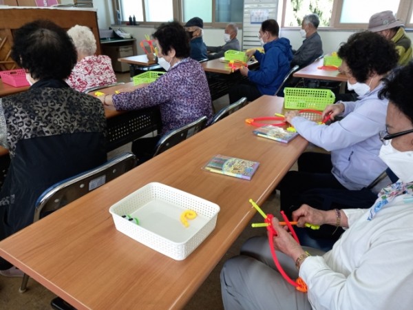 블럭으로 나비를 만들고, 색을 칠하고~ 아이들 같다시며 웃으셨지만, 정성스레 완성하셔 주변 어르신들과 자랑하듯 뽐내시니 사업의 효과를 알 수 있었습니다.