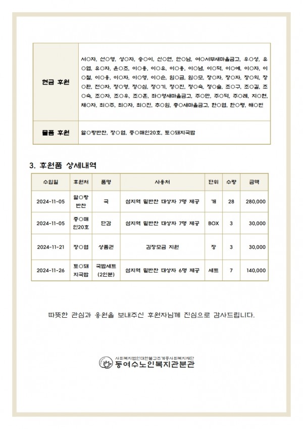 2024년 11월 동여수노인복지관분관과 함께한 고마운 분들입니다.