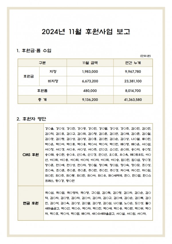 11월 1일 ~30일까지 총 214명 후원자/처께서 총 9,136,200원을 후원해주셨습니다.