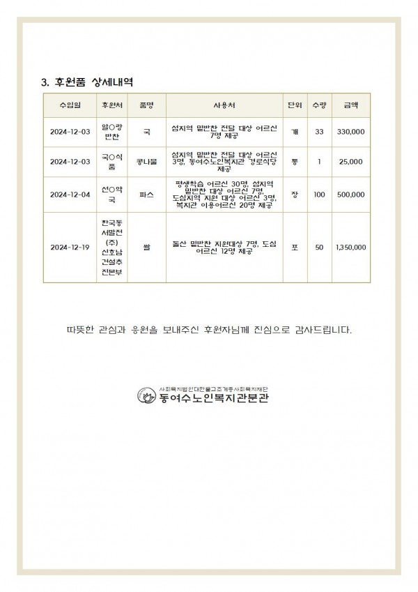 2024년 12월 동여수노인복지관분관과 함께한 고마운 분들입니다.