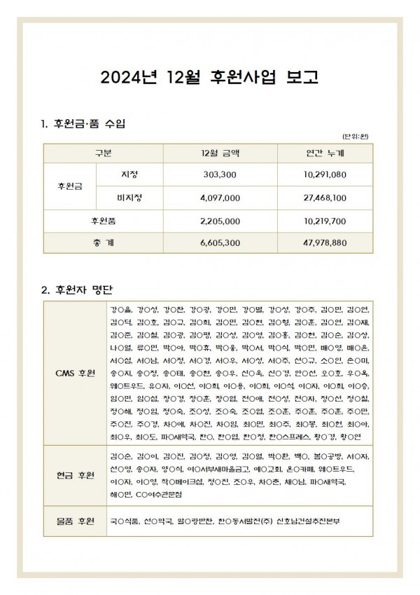 12월 1일~31일까지 총 148명 후원자/처께서 총 6,605,300원을 후원해주셨습니다.