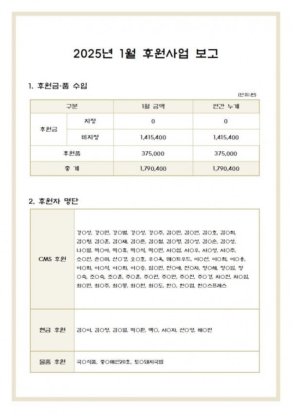 1월 1일~31일까지 총 77명 후원자/처께서 총 1,790,400원을 후원해주셨습니다.