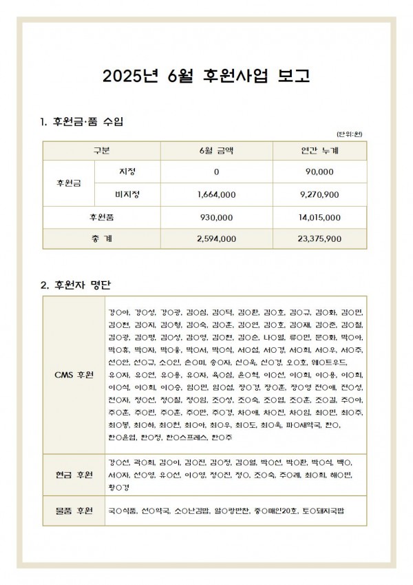 6월 1일~30일까지 총 134명 후원자/처께서 총2,594,000원을 후원해주셨습니다.