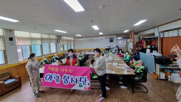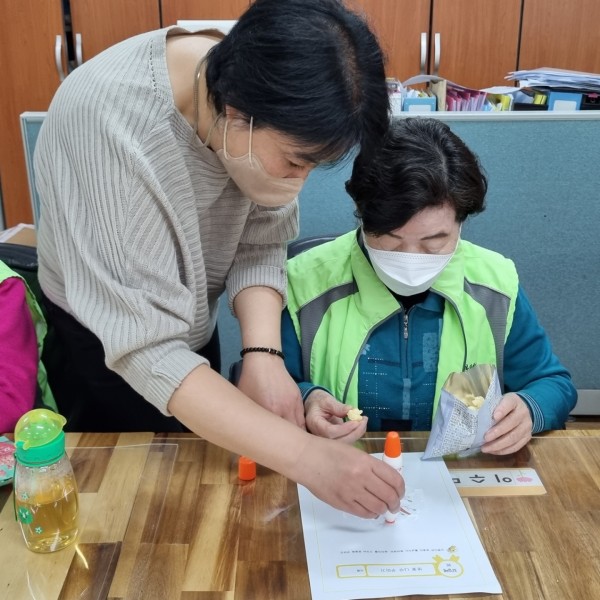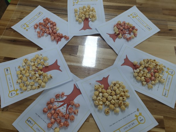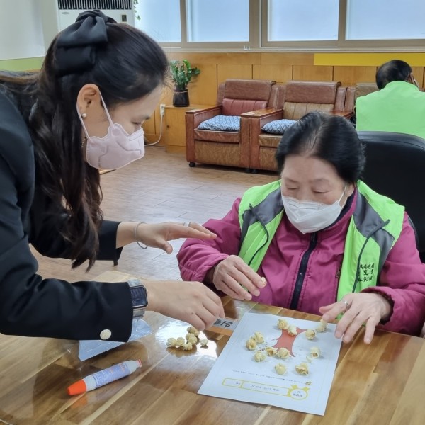 "아람회"여성단체에서 주간보호 이용어르신 대상으로 팝콘으로 벚꽃 만들기 프로그램을