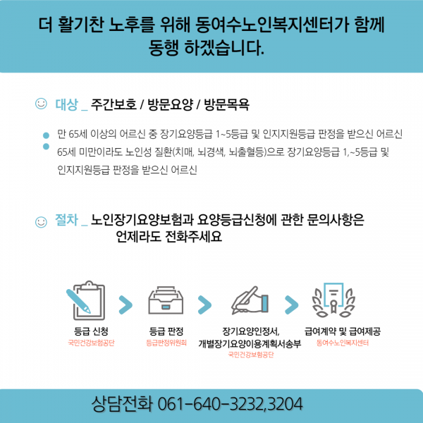 어르신들의 더 활기찬 노후를 위해 동여수노인복지센터 주간보호, 방문요양, 방문목욕팀이
