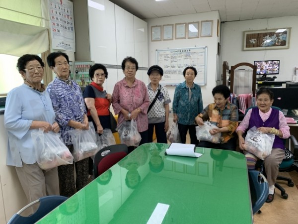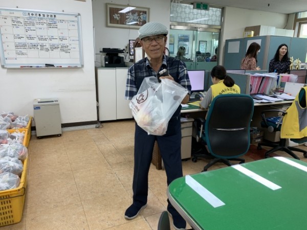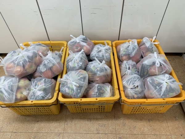 추석연휴동안 어르신의 결식이 우려되어 경로식당에서는 효도급식 대상 어르신에게 대체식을 제공해드렸습니다. 연휴기간이 다소 짧아 두유와 사과를 준비하였습니다.