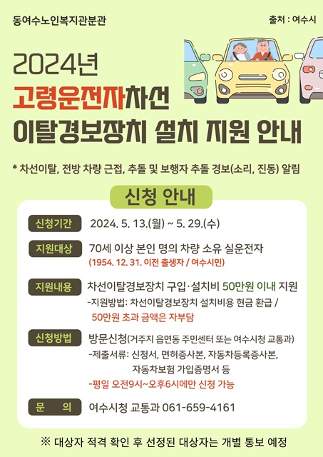 여수시에서 70세 이상 고령 운전자를 대상으로 차선이탈경보장치 설치비를 지원해 드립니다.
