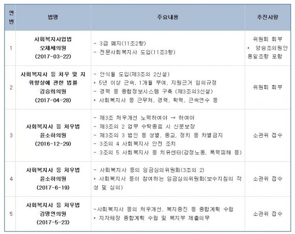 [정책동향] 사회복지사 처우개선 관련 법안 추진 현황 페이지 정보 작성자 박주환 작성일17-08-29 16:25 조회11,293회 댓글0건 관련링크 본문 출처 : 한국사회복지사협회 법안보기 링크 클릭 : http://www.welfare.net/site/ViewPoliticIssue.action?brd_cmd=ViewArticle&brd_boardId=policy_politicIssue&brd_articleId=174415 목록
